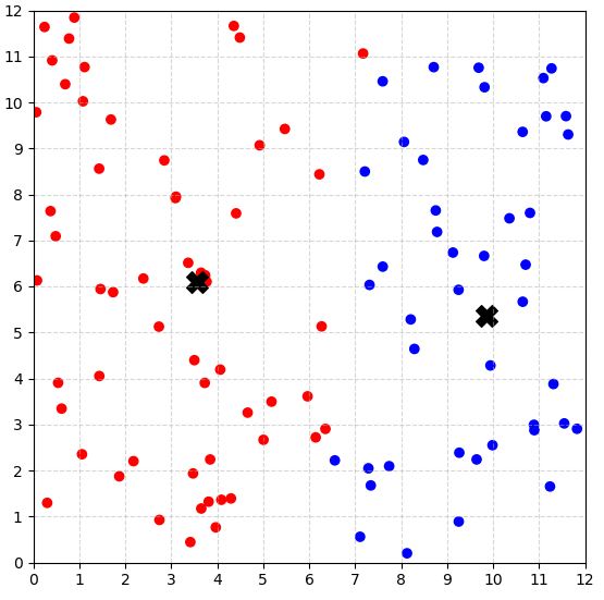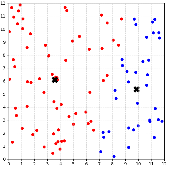 5. Weiter bei Schritt 3. (Die Punkte werden dem nächstgelegenen Zentrum zugeordnet und eingefärbt.)