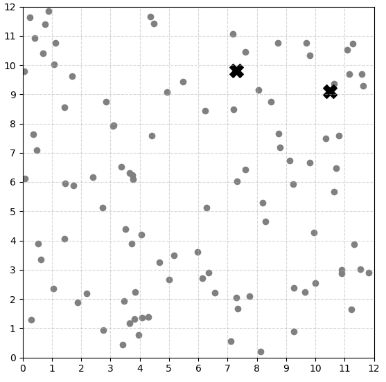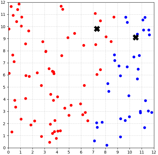 5. Weiter bei Schritt 3. (Die Punkte werden dem nächstgelegenen Zentrum zugeordnet und eingefärbt.)